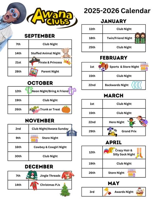 5:15pm - AWANA for age 3 through 5th grade (follows DCS School Calendar)